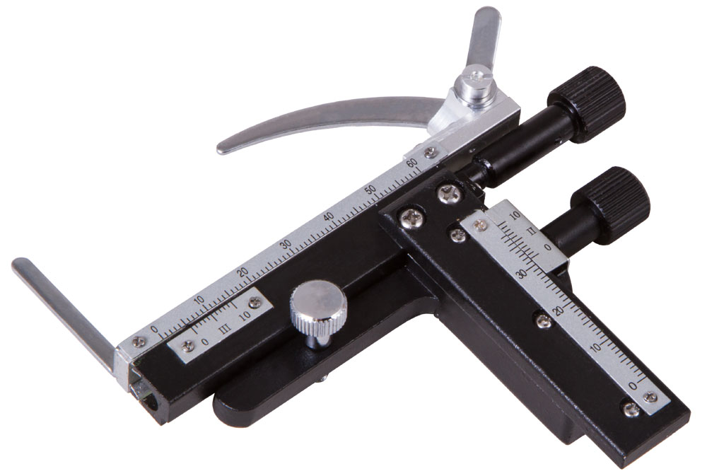 El micrómetro mecánico Levenhuk MS3 se ha diseñado para mover cómodamente los portaobjetos sobre la platina en los ejes X (desplazamiento izquierda – derecha) e Y (hacia delante – detrás). También sirve para definir las coordenadas de la zona de la muestra que desea examinar. Teniendo las coordenadas podrá volver rápidamente a la zona que haya seleccionado anteriormente. La rueda de control permite controlar coaxialmente todos los desplazamientos. Cada eje cuenta con un nonio auxiliar para que las medidas sean de gran precisión.