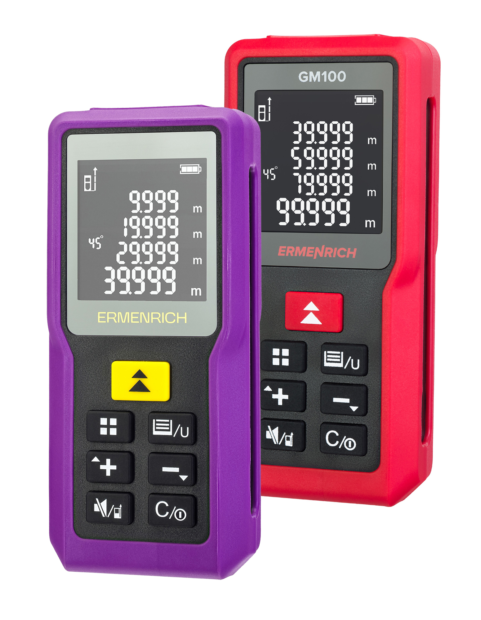El dispositivo Ermenrich Reel PRO GM100 es un medidor láser diseñado para realizar mediciones en obras de construcción y reforma. También se puede utilizar para levantamientos de límites de terrenos y trabajos de topografía, y otras aplicaciones que requieran una medición precisa de las dimensiones lineales de un objeto, su área y volumen. La distancia máxima de medición es de 100 metros. El medidor láser también puede actuar como medidor láser de ángulos. Gracias al empleo del teorema de Pitágoras, el dispositivo puede calcular distancias automáticamente a partir de mediciones intermedias. Este procedimiento es especialmente útil cuando no es posible apuntar el rayo láser de forma precisa desde un punto a otro.