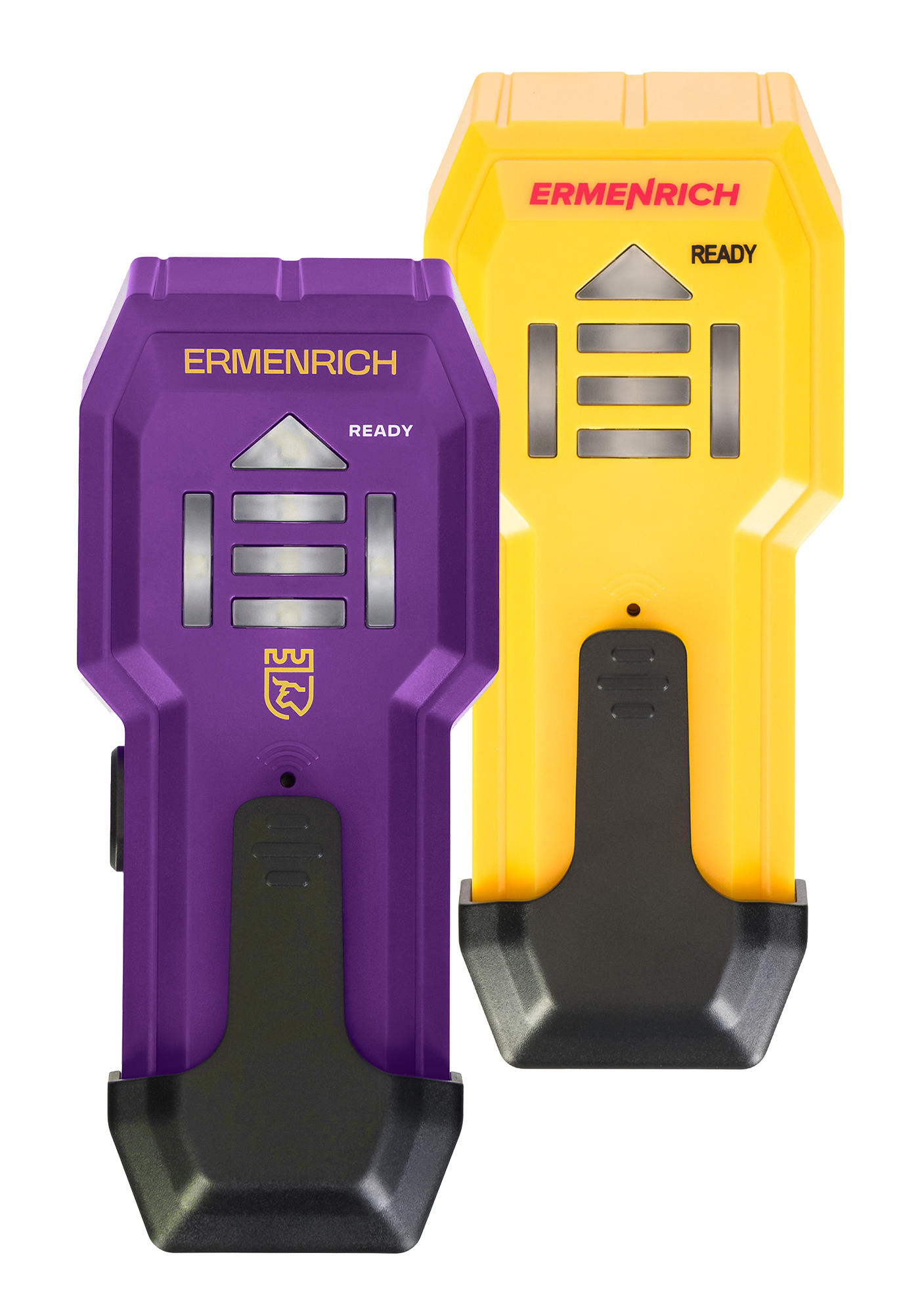 Detector de montantes Ermenrich Ping SA20: instrumento práctico para constructores y técnicos de reparaciones. Este dispositivo compacto puede detectar objetos de metal y madera situados en el interior de paredes, suelos y techos, hasta una profundidad de 19 mm. Puede usar el instrumento para revisar superficies antes de comenzar a perforar agujeros cuando instale equipos, tomas de corriente, muebles y elementos de decoración. Le ayudará a evitar zonas donde exista cableado eléctrico, instalaciones fijas de un edificio y otros objetos ocultos.