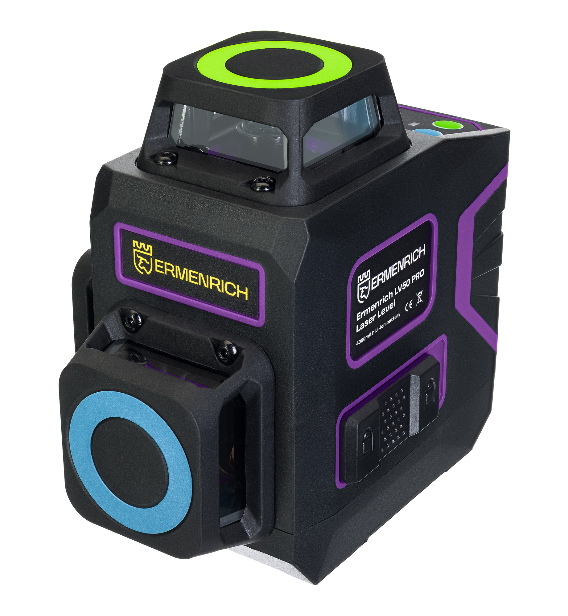 El nivel láser Ermenrich PRO LV50 está equipado con un compensador que reduce las vibraciones y de esta manera el dispositivo alinea automáticamente el plano del láser. Si desea lograr la máxima precisión, puede utilizar una placa objetivo (receptor de rayo láser), que se incluye en el kit. La pila recargable integrada de litio tiene una duración prolongada, y el mando a distancia funciona con pilas. Hay cuatro niveles de brillo disponibles para el rayo láser, lo que facilita el establecer los ajustes óptimos para todas las condiciones de iluminación. El nivel láser está diseñado para funcionar en un amplio intervalo de temperatura, incluso por debajo del punto de congelación, y está protegido contra el polvo y las salpicaduras.