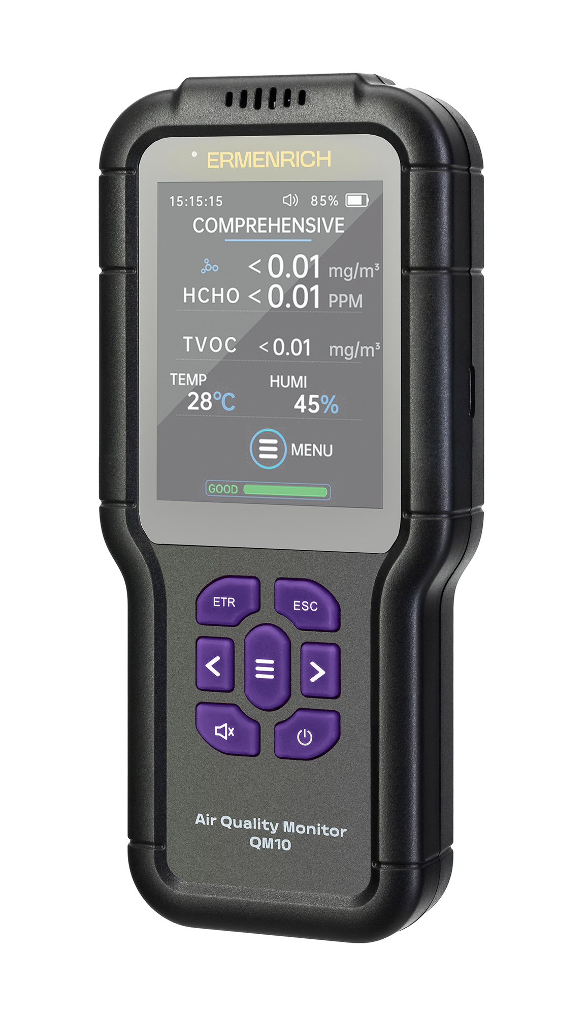 El medidor de calidad del aire Ermenrich QM10 es un instrumento portátil para analizar la composición del aire interior, detectar niveles elevados de sustancias nocivas y controlar el microclima. Se puede utilizar en entornos domésticos y comerciales (oficinas, hoteles, escuelas y guarderías, cafeterías, tiendas, etc.), pero no para fines industriales, ya que el intervalo de medición de TVOC (compuestos orgánicos volátiles) es de 0,0 a 10,0 mg/m3, lo que es insuficiente para detectar las concentraciones más altas que se encuentran habitualmente en entornos industriales.