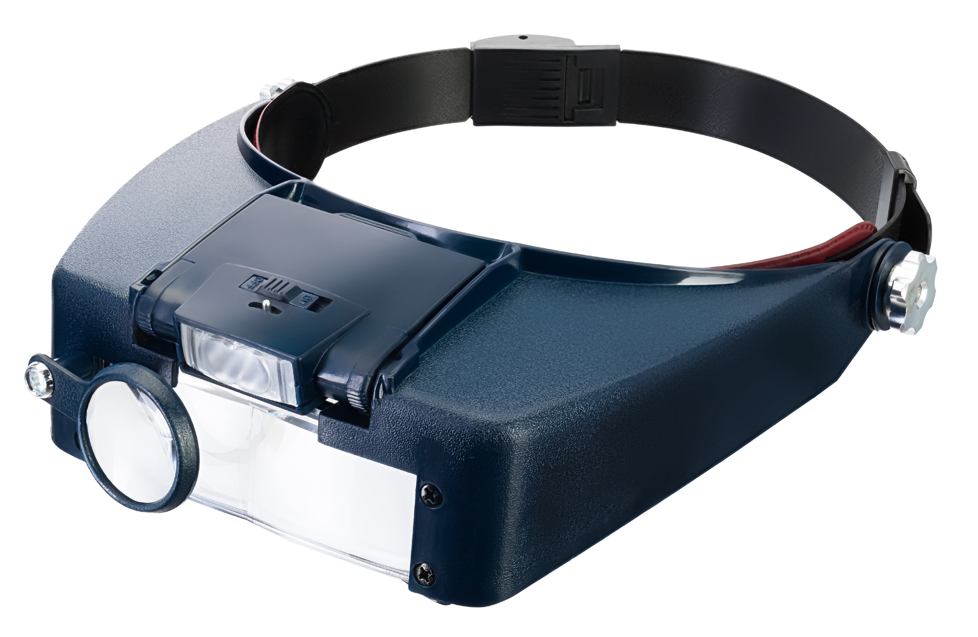 La lupa se sujeta a la cabeza con una banda de tamaño ajustable. La iluminación funciona con pilas.