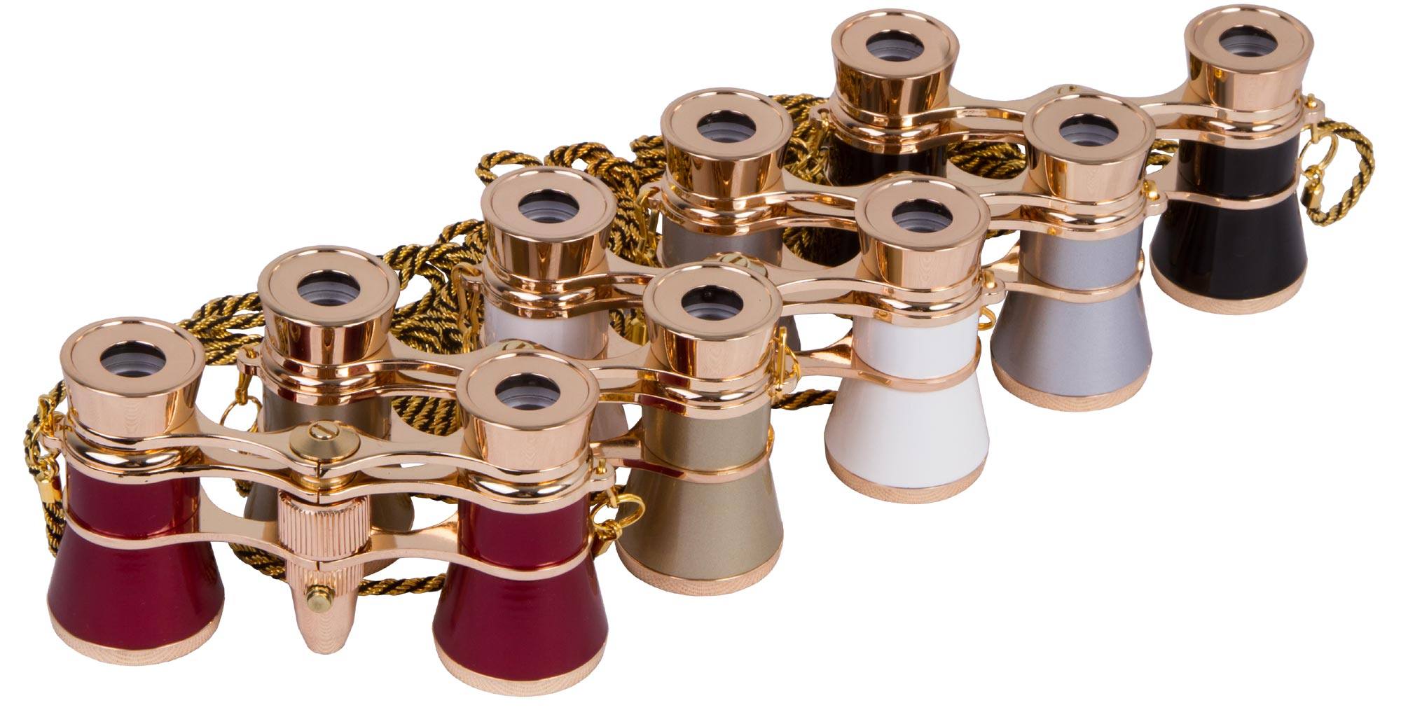 Gama Levenhuk Broadway 325F: elegantes binoculares de teatro con luz LED. Los binoculares vienen equipados con una fina cadena metálica. Cada modelo se entrega con una suave funda y con un pañito de limpieza. La caja de embalaje tiene impreso un dibujo relacionado con el teatro.