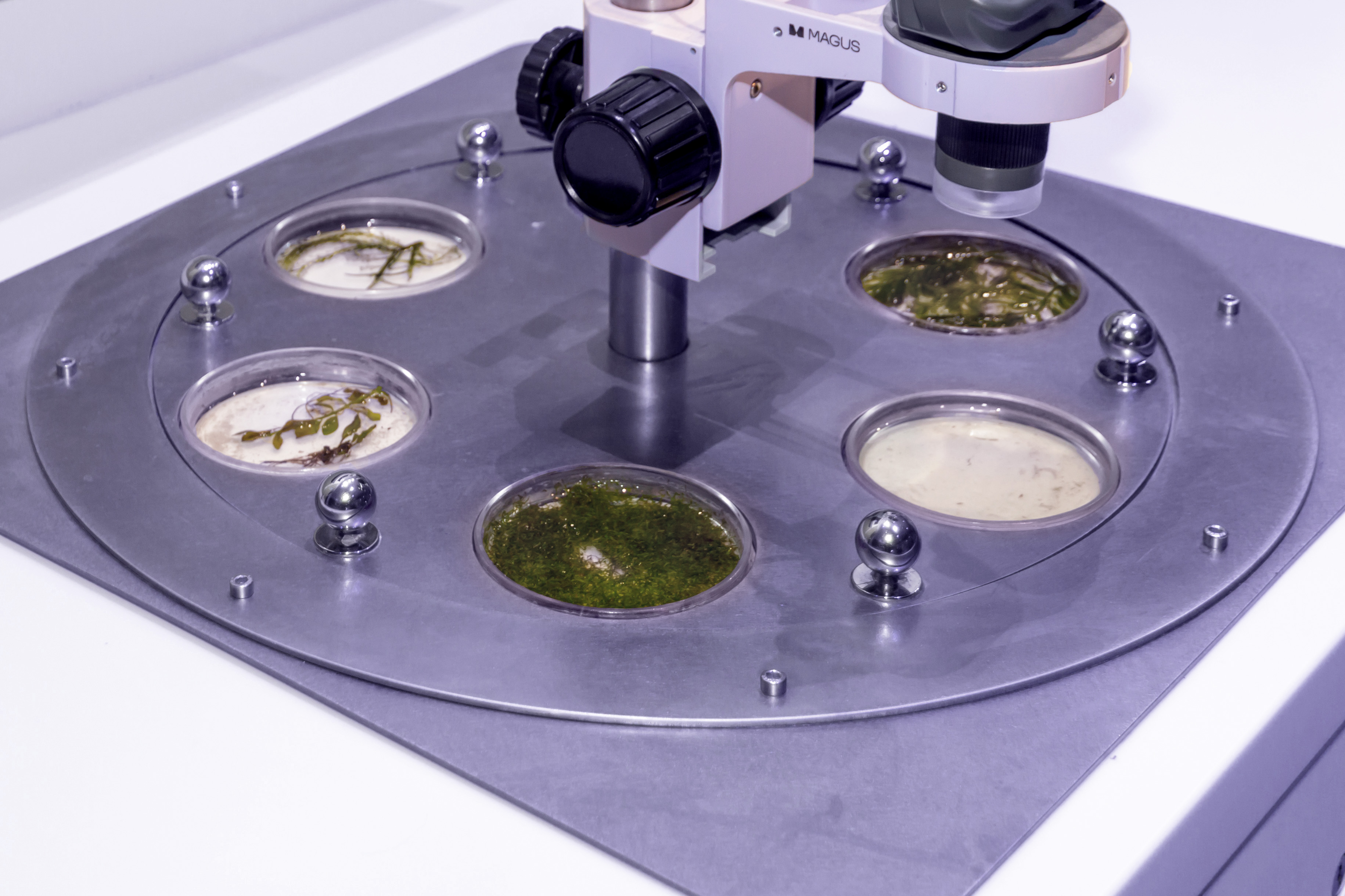 Las estaciones de investigación están equipadas con microscopios estereoscópicos, cámaras digitales y pantallas. Gracias a este diseño, todos los visitantes pueden utilizar el microscopio, cambiar la muestra de forma independiente y ver muestras de tejidos y microorganismos en una pantalla grande.